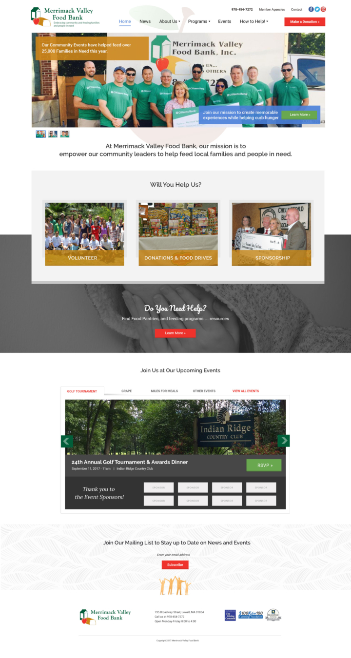 Merrimack Valley Food Bank needed a site with multiple custom sections including a list of Agencies, Events with featured Sponsors, Staff and Board of Directors, and Custom Forms to integrate with their Payment Gateway